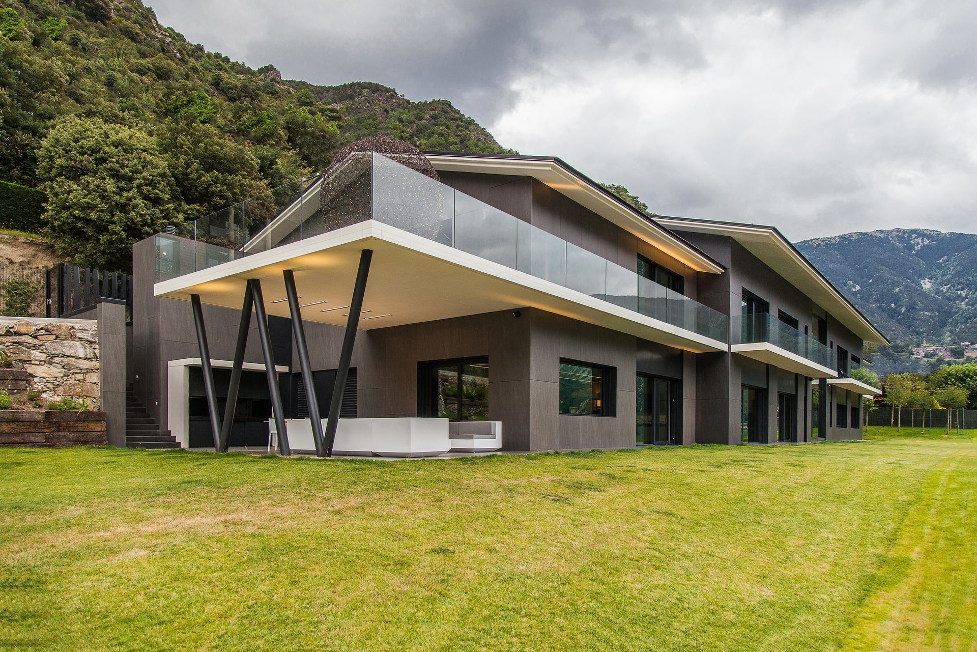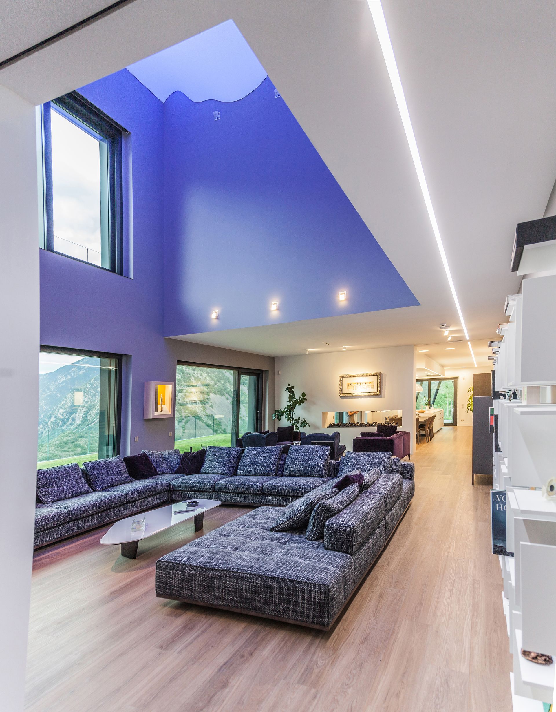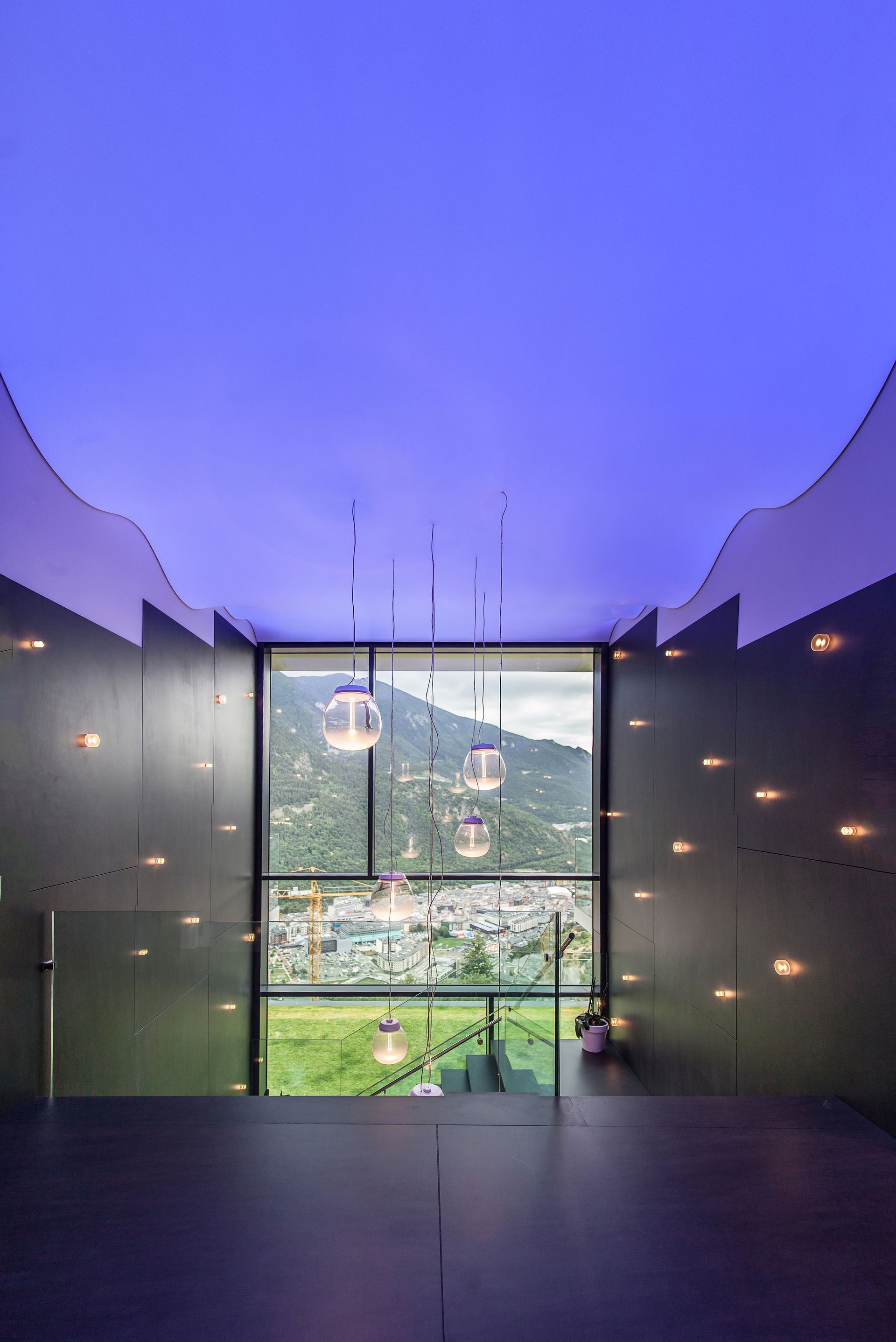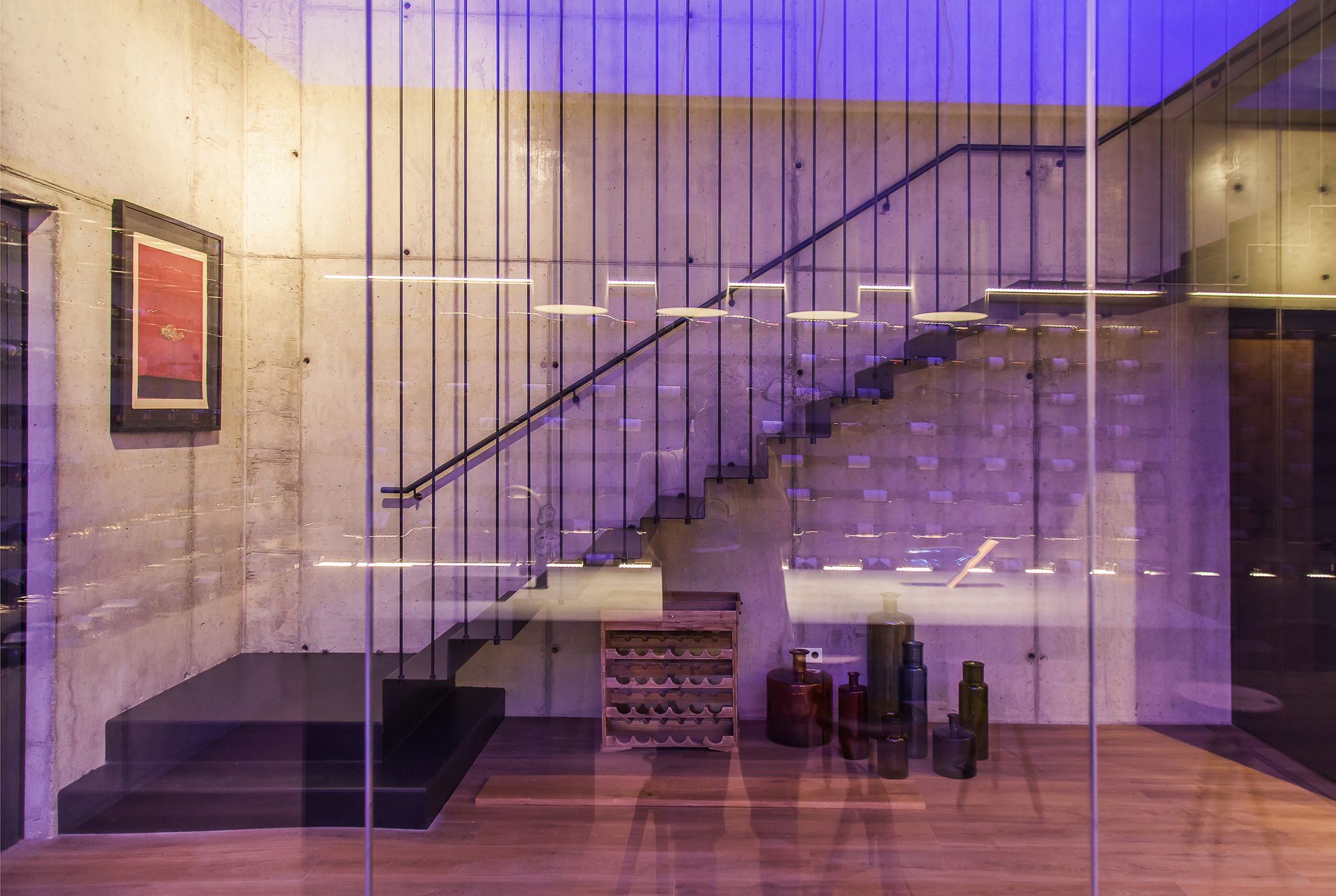 Finalment, una escala monumental tancada amb un gran vitrall amb vistes a la vall connecta ambdós nivells de l’habitatge.