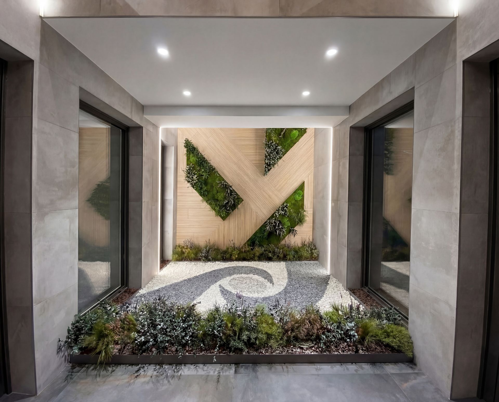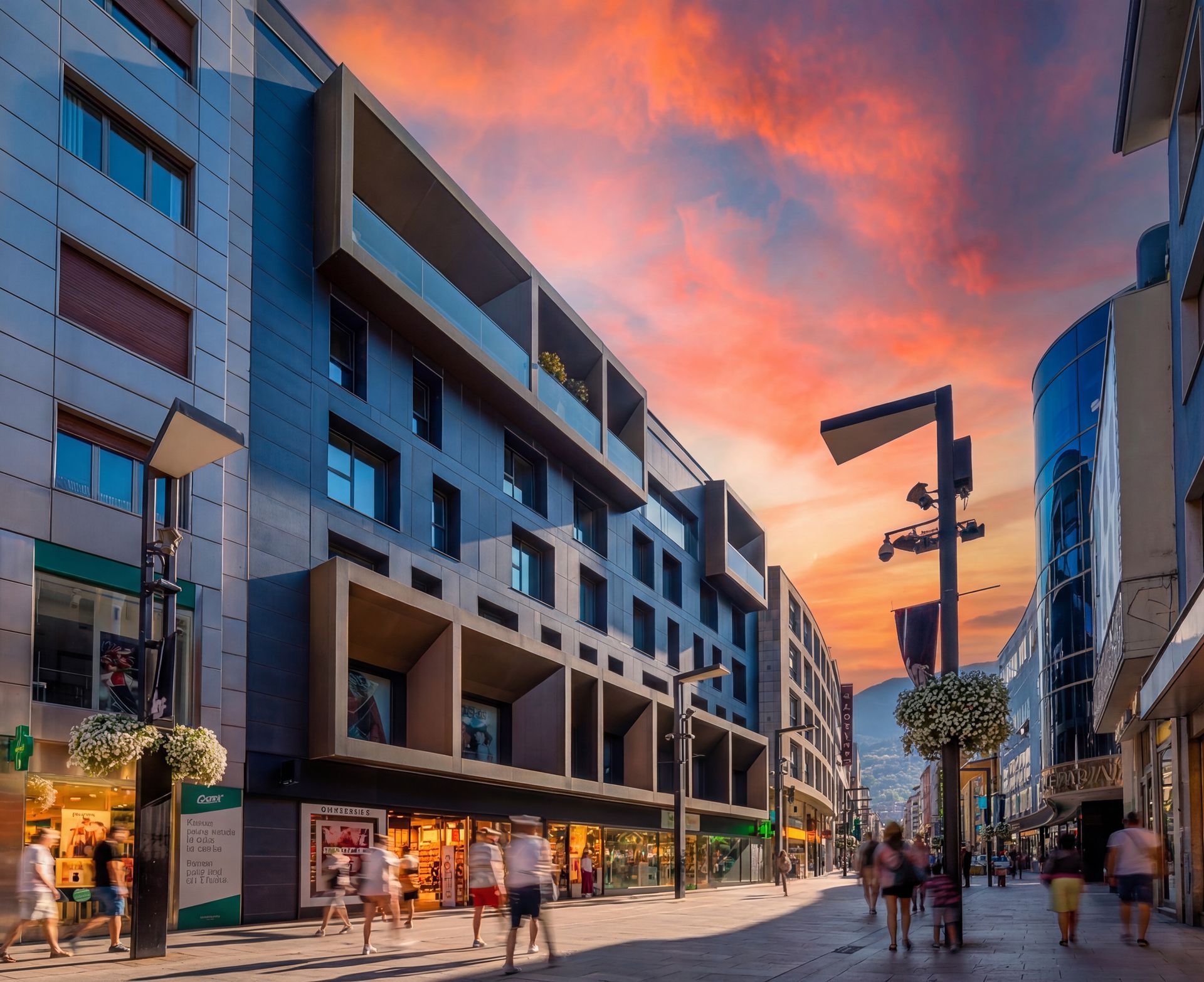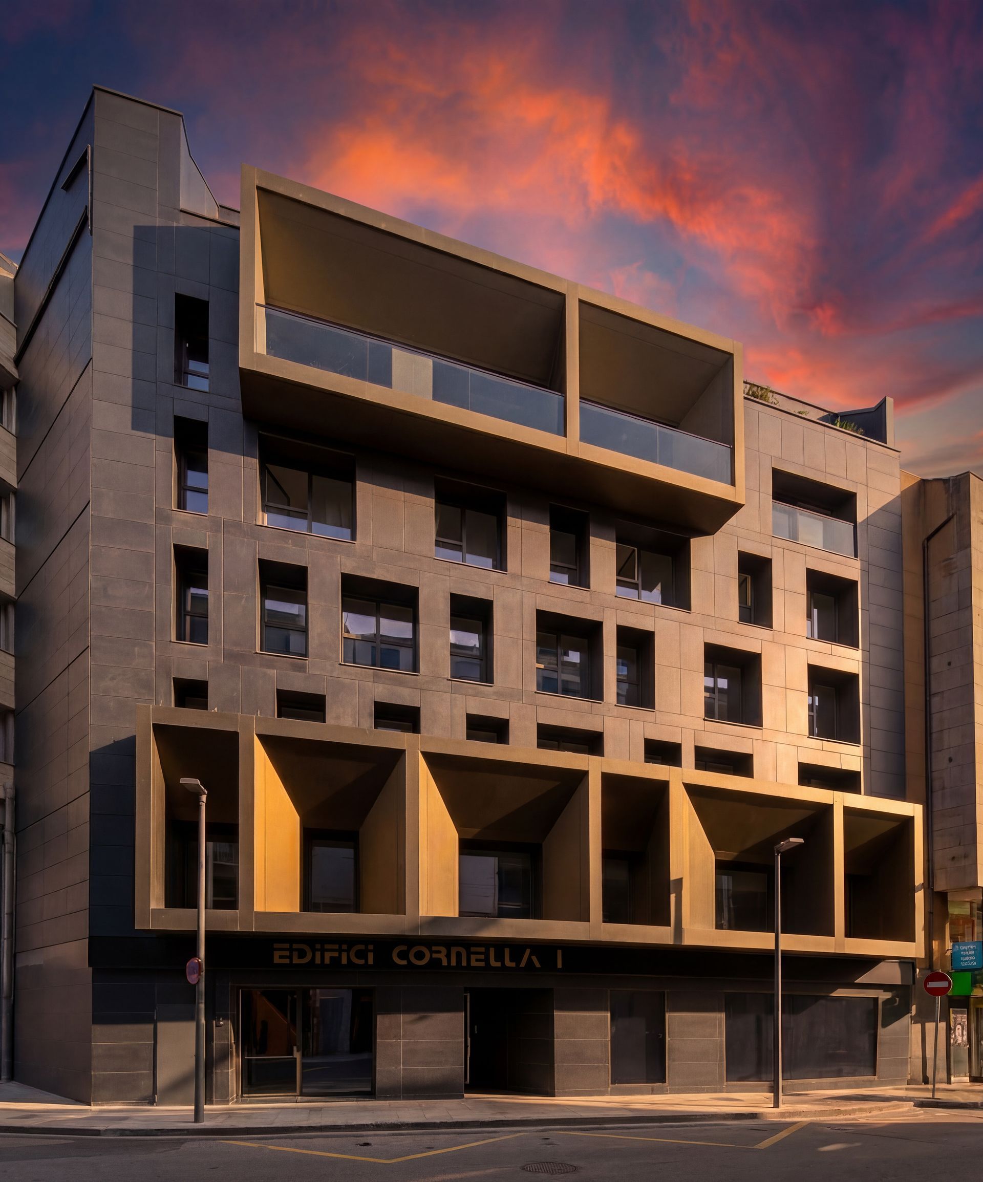 La rehabilitació de l'històric Hotel Cornella a Andorra la Vella supera una complexitat tècnica exigent per erigir un edifici multifuncional on prevalen l'elegància i el luxe. El volum s'estratifica estratègicament: un sòcol comercial actiu, un cos central d'oficines i un coronament residencial exclusiu. Arquitectònicament, la façana articula un fort diàleg matèric entre la base d'imitació pissarra i unes tribunes volades d'Alucobond daurat que reaccionen dinàmicament a la llum solar. Com a contrapunt i pulmó del projecte, s'integra vegetació autòctona exterior i grans murs vegetals als patis interiors, garantint la màxima qualitat ambiental.