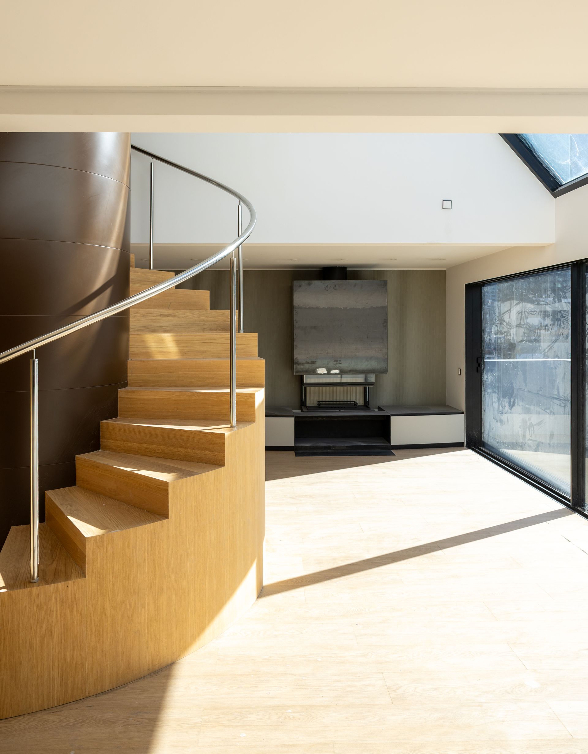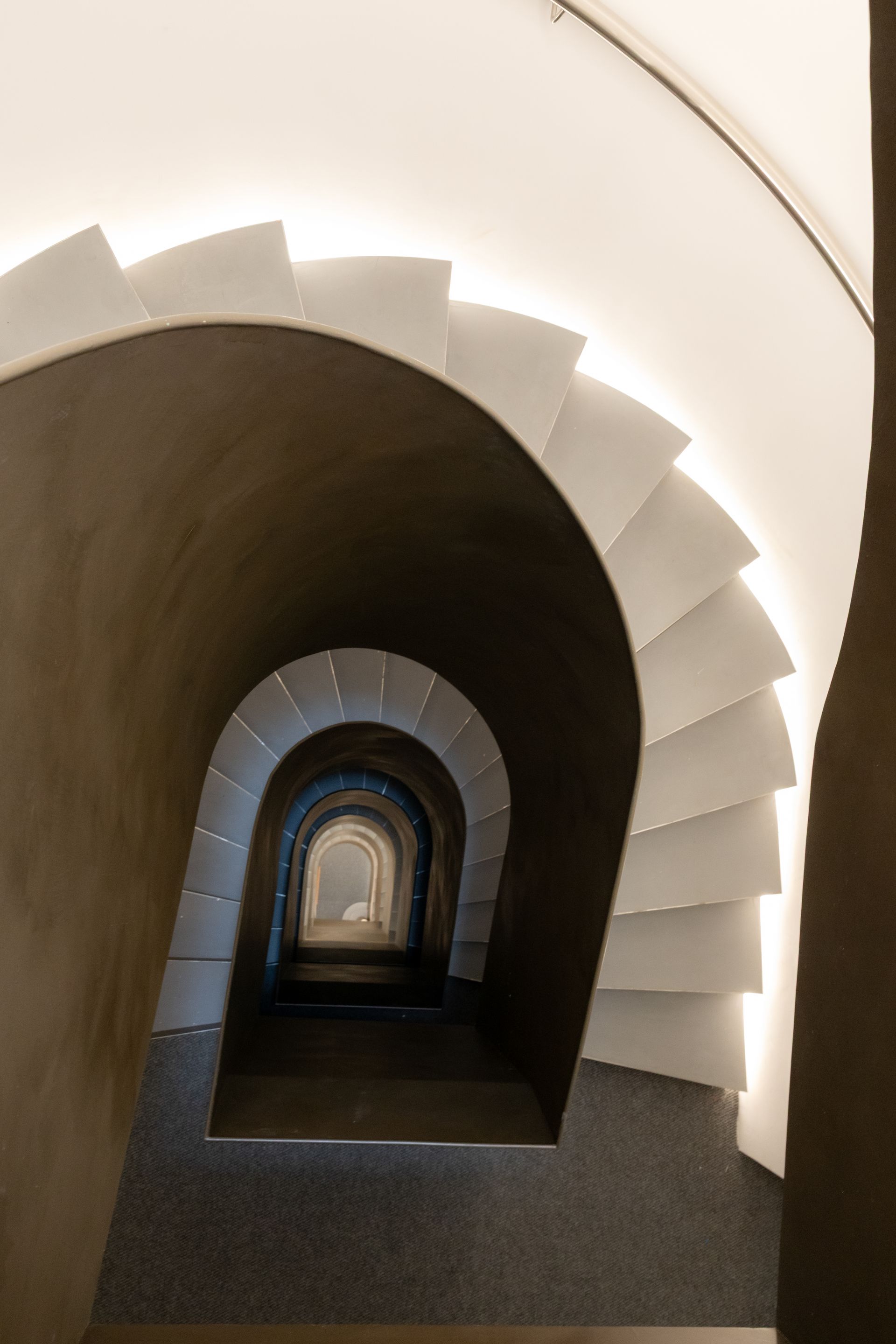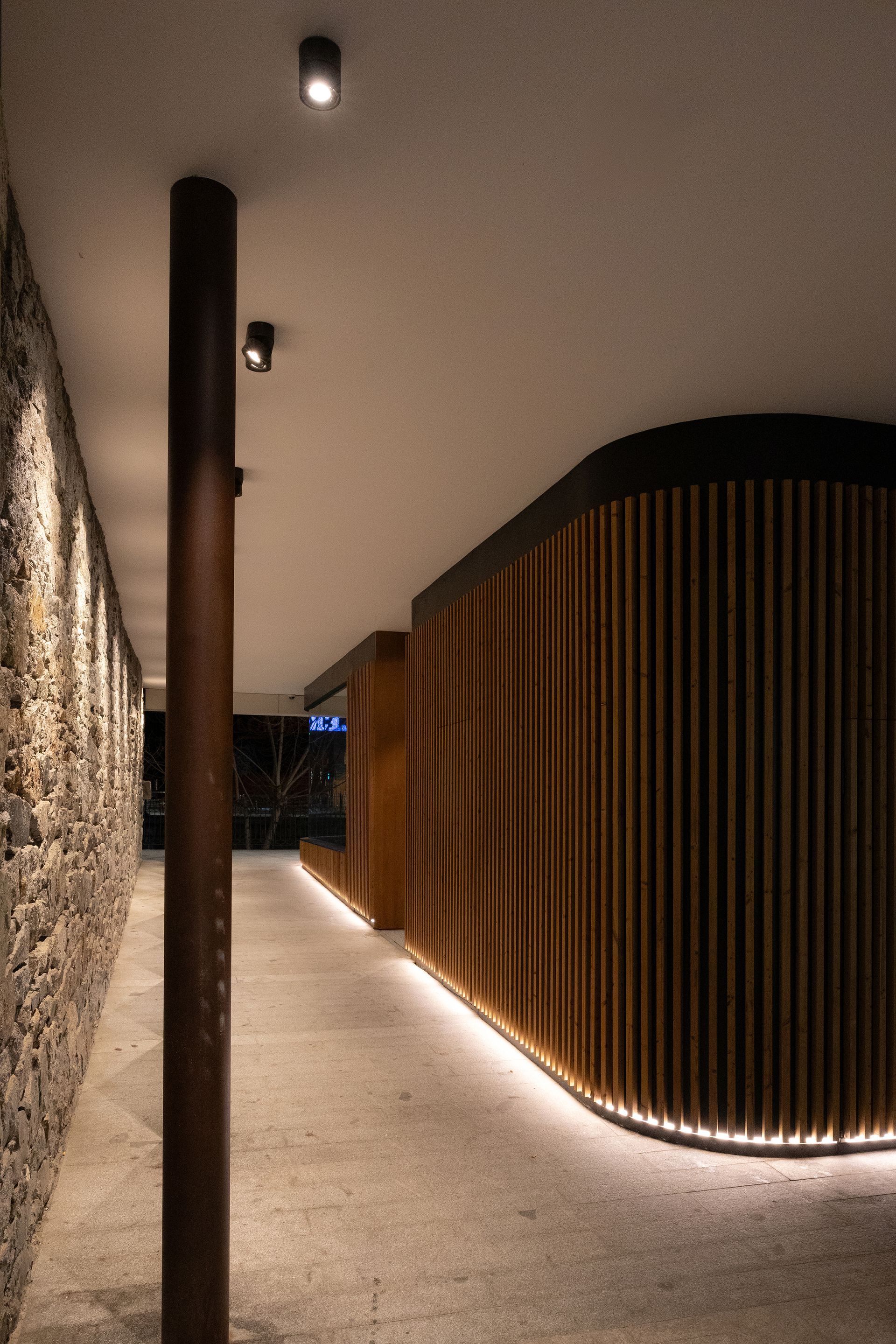 La mitgera de pedra compartida amb el veí mostra la seva historia en el passatge de vianants, que comunica ambdues façanes i ens facilita l’accés a l'edifici, mitjançant una escala central com una pell de taronja.