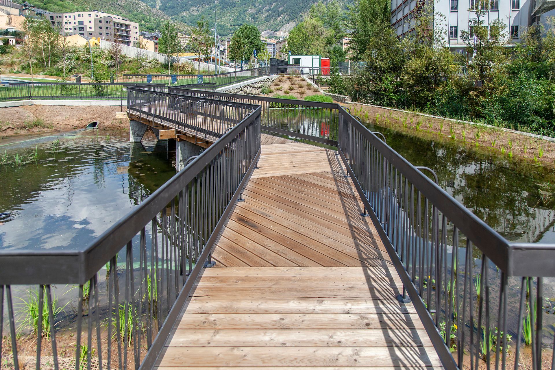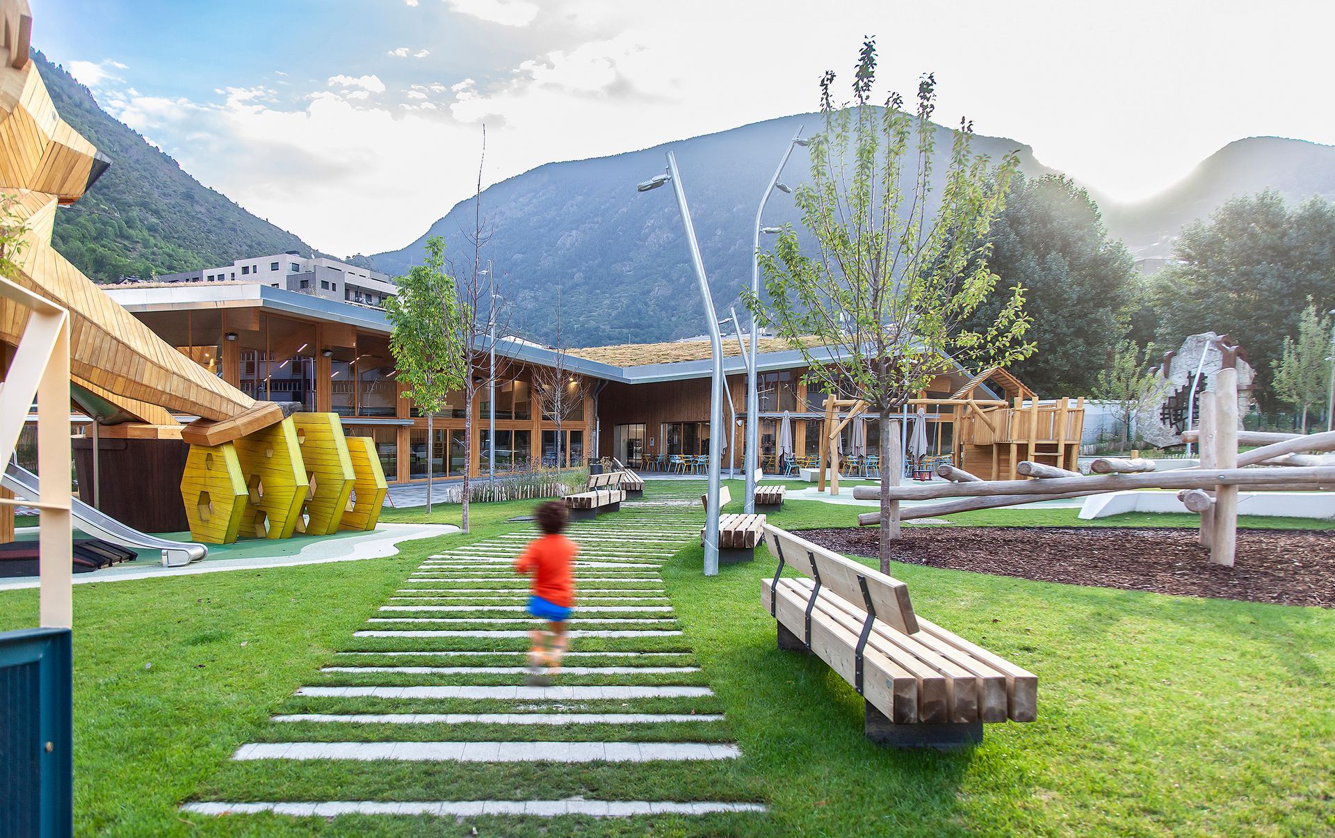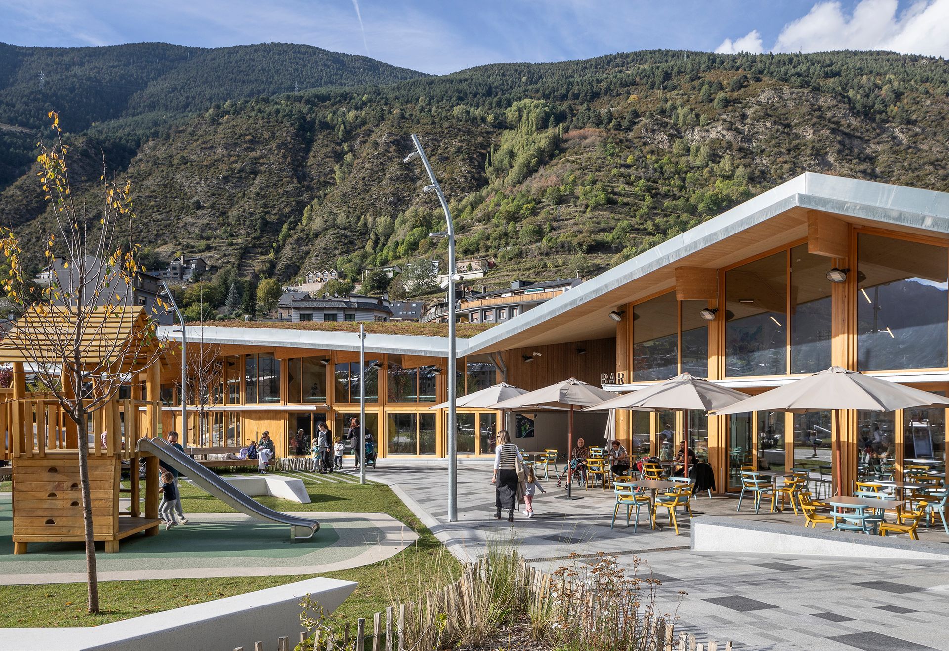 El parc de l’Ossa s’ubica en terrenys de cessió del desenvolupament urbanístic i es planteja com un gran espai verd integrat amb el teixit urbà. La proposta soterrà el vial actual per evitar fragmentar el parc i concentra els equipaments al nord, deixant al sud l’espai verd, assolellat i obert al riu. Els edificis, de fusta i amb criteris passius, s’orienten al sud per aprofitar el sol a l’hivern i es protegeixen del sobreescalfament a l’estiu. La vegetació combina una franja fluvial, amb arbres i jocs. Les cobertes vegetals milloren la gestió de l’aigua i redueixen l’efecte d’illa de calor.